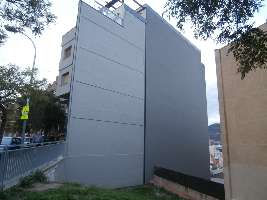 Las fachadas medianeras se han hecho con un SATE proyectado, también de la casa Weber, del tipo WEBER THERM AISLONE. Consiste en mortero mezclado con aislamiento térmico que se aplica con máquina de proyectar. Se han hecho diferentes grosores y dos colores para que la superficie era muy grande y para jugar un poco con la estética. El departamento de Paisaje Urbano del Ayuntamiento de Barcelona es quien ha decidido los colores, y además ha obligado a hacer en la parte superior unas perforaciones en la chapa de remate, creando un cubículo aislado, para que pudieran hacer nidos las golondrinas que hay el barrio. Estas medianeras también están rematadas por la parte superior de perfiles de aluminio lacados.