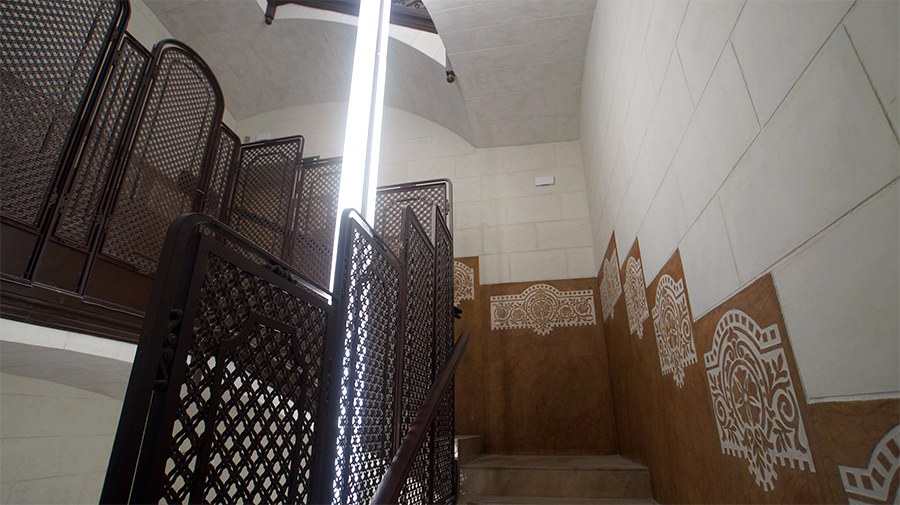 - En los patios interiores se ha procedido a buscar los vestigios de origen y, una vez hechas las reparaciones de estuco, se ha restituido puntualmente el acabado enlucido fileteado y se ha recuperado el vestigio de los patios con técnicas de veladura, dando con pátinas el espíritu envejecido.