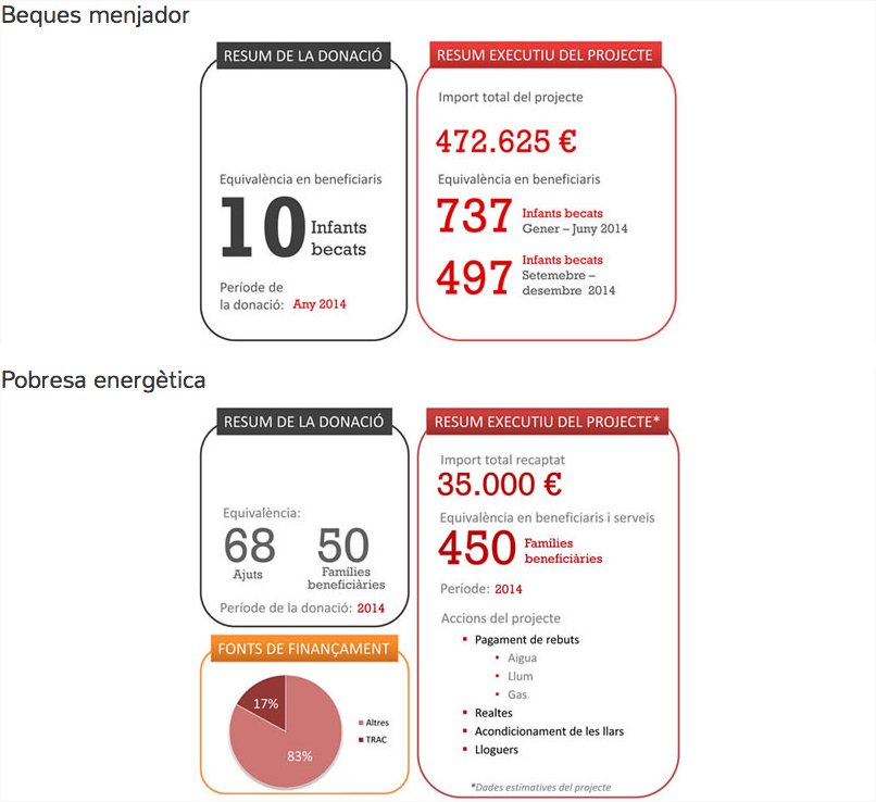 A lo largo del 2014, las aportaciones de TRAC a la Creu Roja supusieron la equivalencia en beneficiarios de 10 niños becados del proyecto de Becas Comedor, y 50 familias que dispusieron de 68 ayudas a través del programa de Pobreza energética.