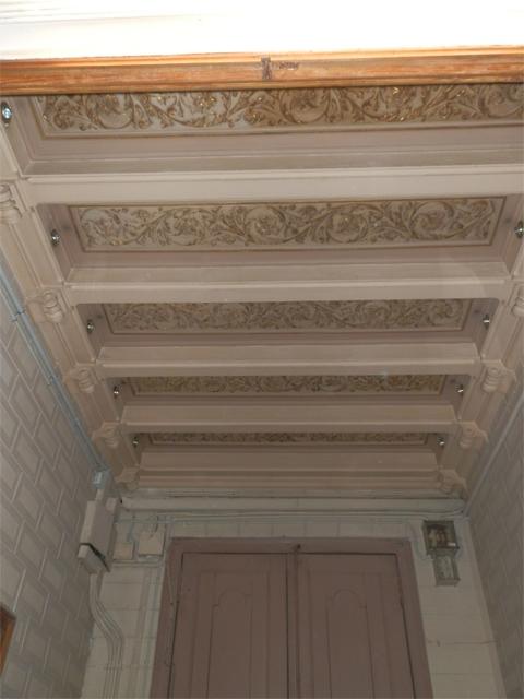 • Restauración de artesonado de techo de vestíbulo consistente en decapado, reparación puntual e integración cromática según vestigios descubiertos.
