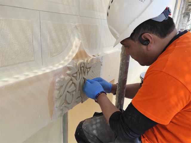 • Reconstrucción de volúmenes y nuevo estuco en las molduras decorativas de fachada.
